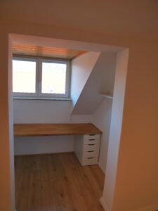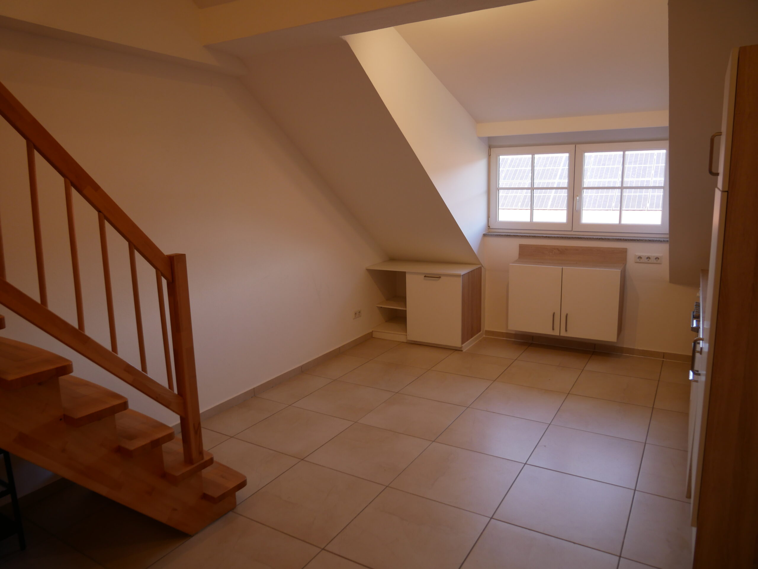Auf der unteren Ebene liegen die Küche sowie der großzügige Wohnbereich mit einer lichtdurchfluteten Schreibtischnische – ideal für Homeoffice oder kreative Projekte. Eine elegante Holztreppe verbindet den Wohnbereich mit dem privaten Dachgeschoss.