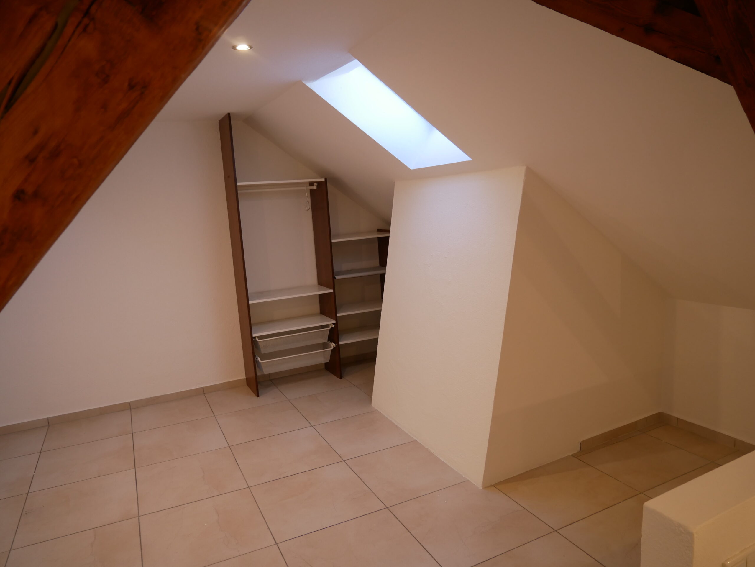 Im oberen Stockwerk befinden sich das Bad mit WC sowie das behagliche Schlafzimmer mit sichtbarem Dachstuhl. Die freiliegenden Holzbalken und das Dachfenster schaffen eine besonders warme und romantische Wohnatmosphäre.