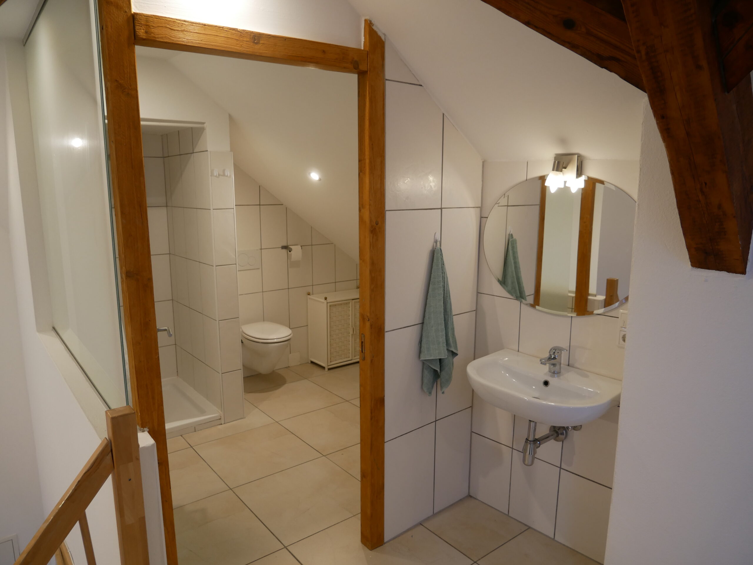 - Bad/WC mit Fliesenboden und Fußbodenheizung, Dusche, WC, Waschbecken und Waschmaschinenanschluss